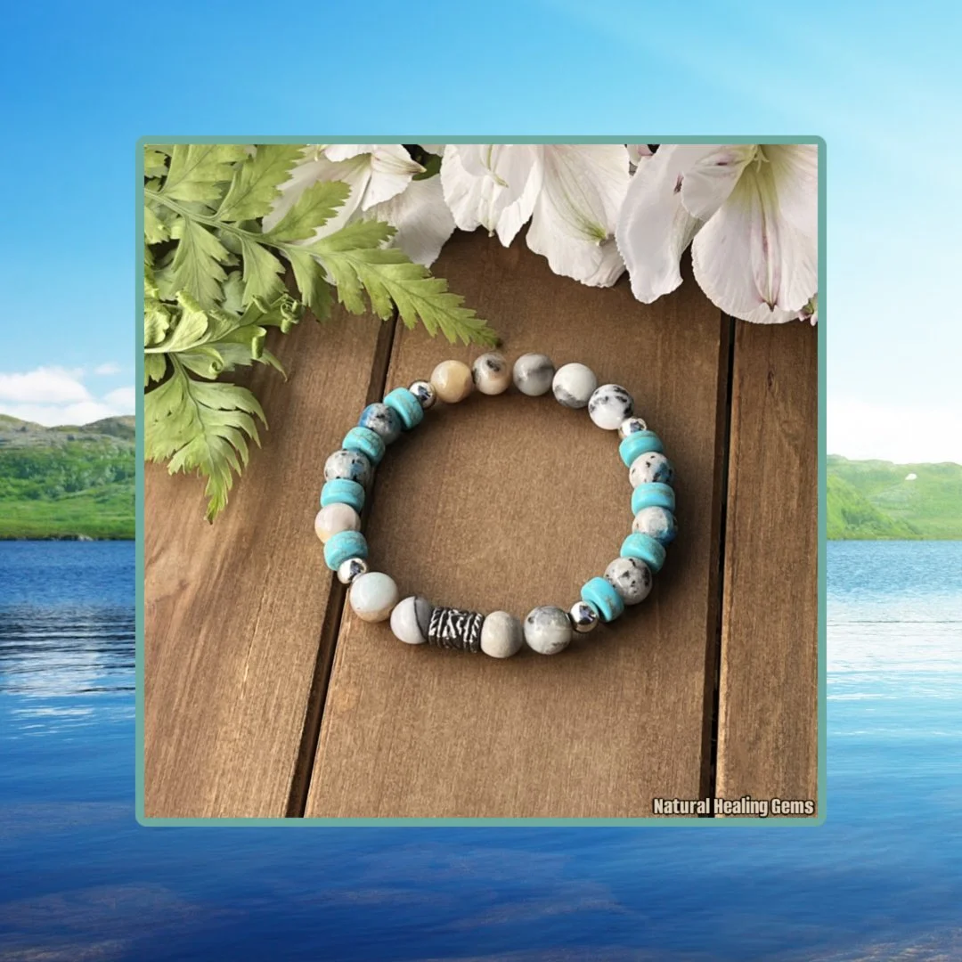 Gain insight and become enlightened with this natural gemstone bracelet. This bracelet is made with K2 Stone, Blue Howlite, and Amazonite. K2 Stone inspires awareness, clarity, and higher consciousness. This blue spotted gemstone connects to the Third Eye Chakra and provides faith in what’s to come. Blue Howlite calms the mind, allowing wisdom and insight to sink in. Amazonite aligns the Heart and Throat Chakras, improving integrity and freedom of expression. Achieve enlightened understanding and spiritual growth with this blue and white gemstone bracelet.