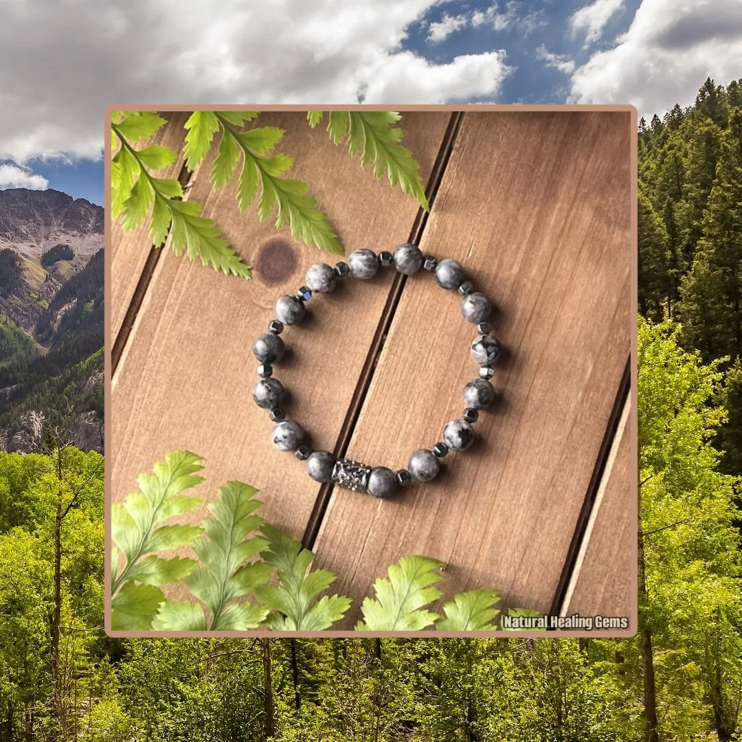 Protect yourself from negative energy with this Larvikite and Hematite bracelet. This natural gemstone bracelet activates the Root and Third Eye Chakras, providing a higher perspective. Larvikite (also known as Black Labradorite) brings feelings of support, energy protection, and grounding. It provides awareness of energy attachments and gives strength for releasing them. Hematite restores peace and harmony, it brings awareness to thoughts and gives stability. Protect your energy with this healing gemstone bracelet.
