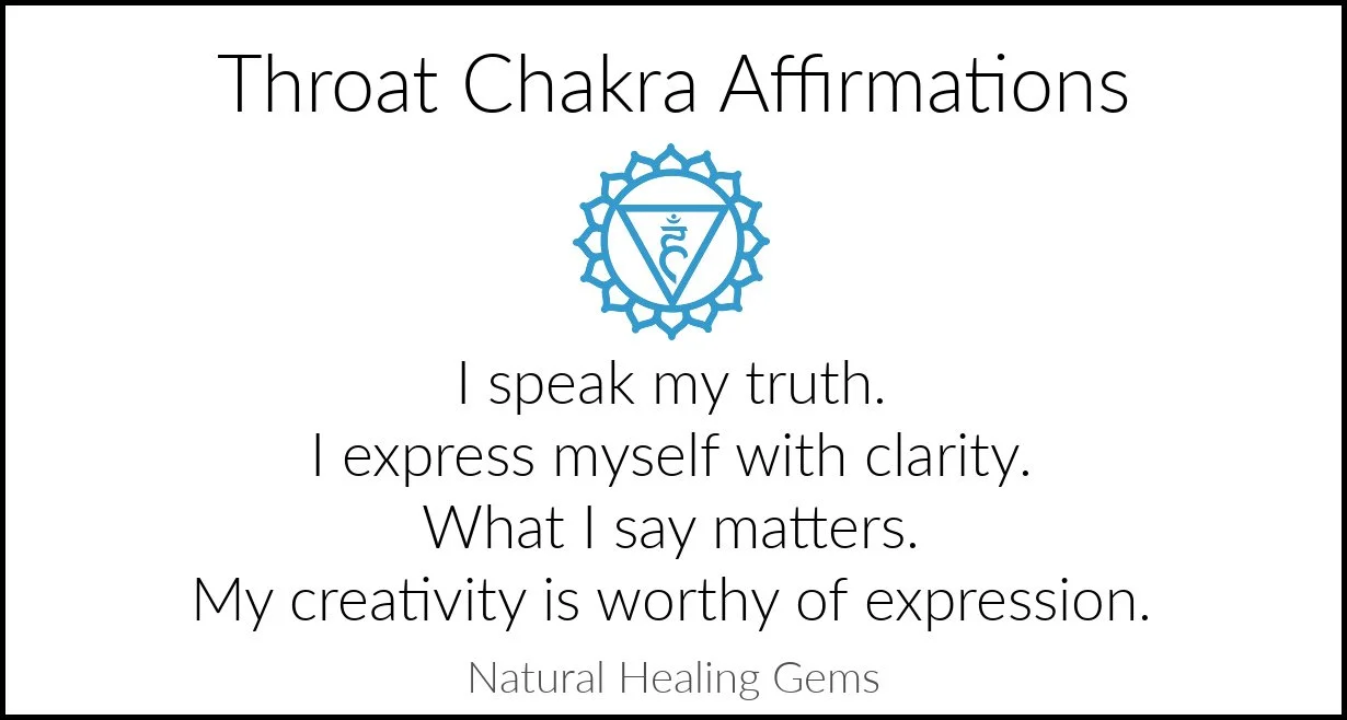 THROAT CHAKRA: The Fifth Chakra. Represented by the color blue. Influences self-expression, realization of purpose, verbal and non-verbal communication, and intuition. The Throat Chakra determines the ability to express oneself in a creative and authentic way.