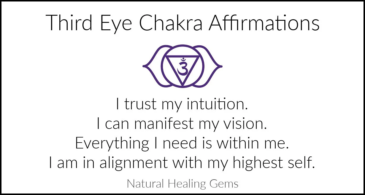 THIRD EYE CHAKRA: The Sixth Chakra. Represented by the color indigo. Associated with intuition, wisdom, insight, and psychic abilities. The Third Eye Chakra surpasses physical senses and allows inner perception, vision, and insight.