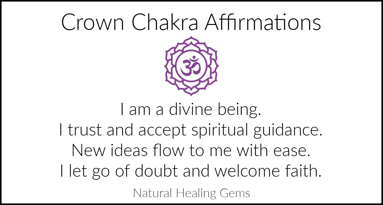 CROWN CHAKRA: The Seventh Chakra. Represented by the color violet. Allows access to higher states of consciousness. The Crown Chakra is associated with awareness, unity, presence, spiritual ecstasy, and enlightenment.