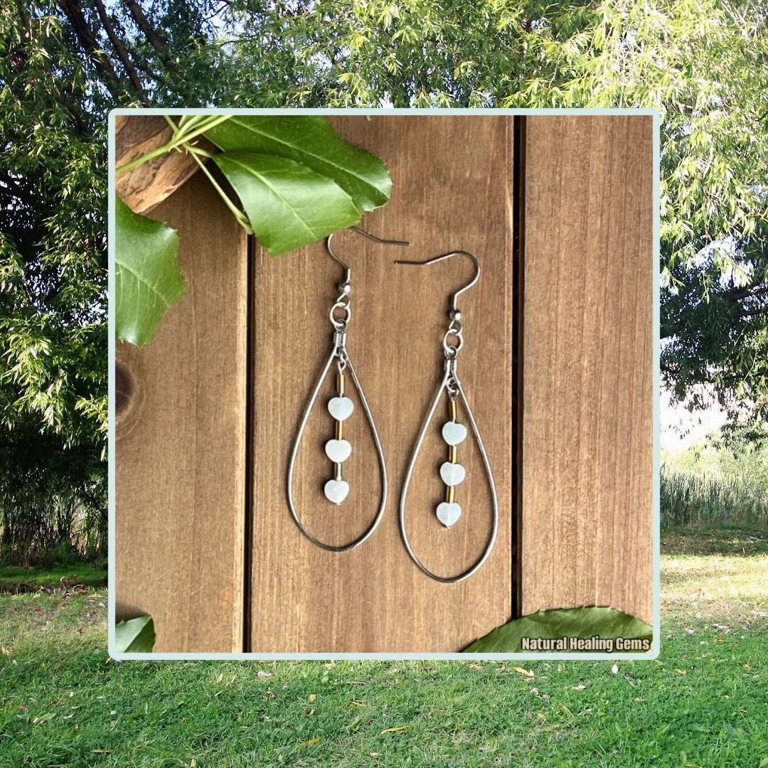 Feel calm, centered, and easy-going with Amazonite. These Amazonite heart earrings seek harmony through balanced perspectives and honest communication. This gemstone reduces stress and gives confidence for self-expression. Speak from the heart with these Amazonite healing earrings.