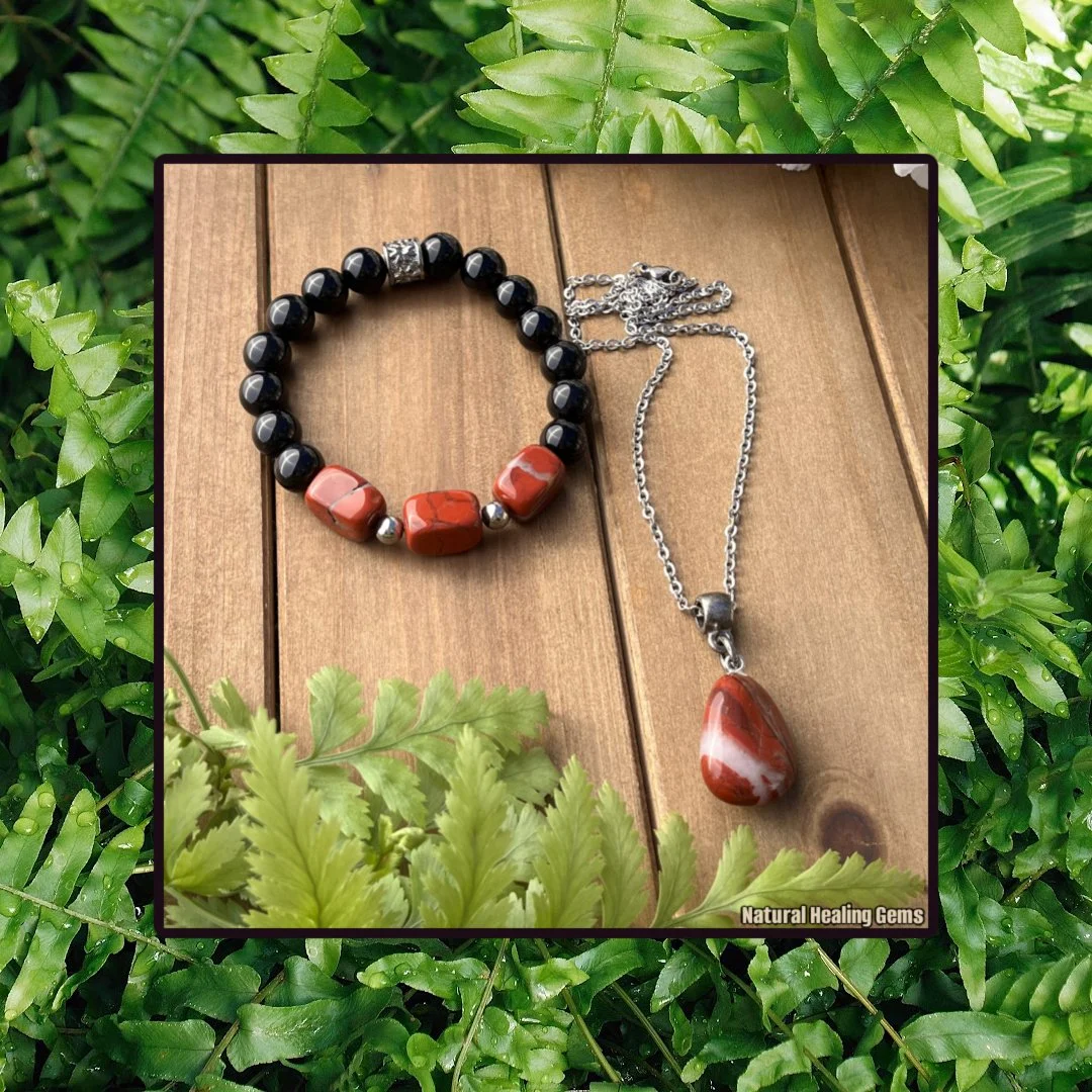 Boost determination and reach a state of wholeness with this Red Jasper and Onyx necklace and bracelet set. This gemstone jewelry set includes large bead stretch bracelet, with 24” pendant necklace. Red Jasper is grounding and stabilizing, this red gemstone nurtures tranquility and confidence. It connects to the Root Chakra and enhances circulation, contributing to increased determination and motivation. Onyx improves personal strength, this shiny black gemstone gives support and spiritual alignment. Feel calm, confident, and on the path toward personal growth with this natural gemstone jewelry set.