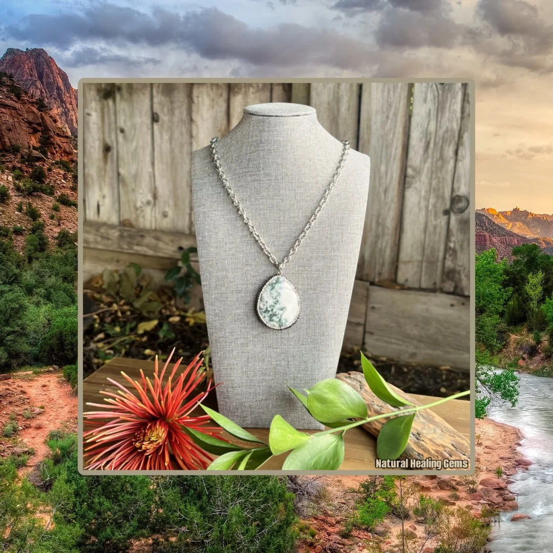 Connect with nature and enjoy tranquil moments with this Tree Agate healing necklace. This is a large gemstone pendant with stud trim and thick 24” chain. Tree Agate strengthens inner peace and aligns with the natural ability to grow and prosper. It soothes tension and creates balance through inner and outer harmony. Cherish soothing effects of gentle grounding and connection with this Tree Agate pendant necklace.
